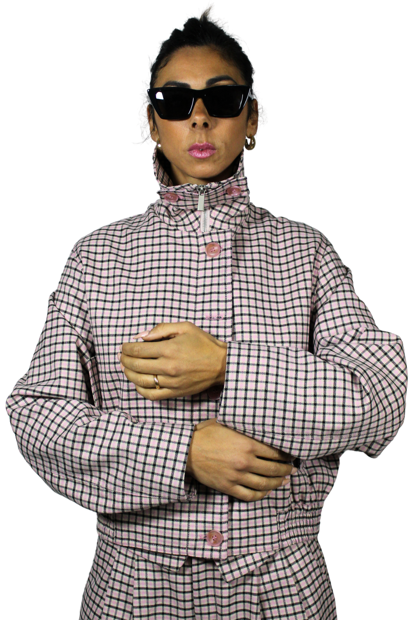 Giacca corta con collo alto e chiusura frontale con zip e bottoni a pressione, che offre un fit moderno e accattivante.